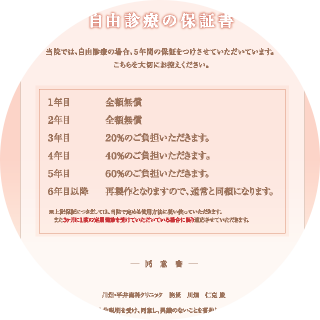 岐阜プレシャス歯科・矯正歯科.では、保険外治療における保証書の発行をしております。患者さまが治療後も安心いただけるよう、定期健診(3ヶ月毎)を受診いただくことで、保険外治療においてセラミック治療は5年間、インプラントフィクスチャーは10年間、その他各種保証をさせていただきます。通常使用での破損や不具合については、保証書のご提示により無償あるいは割引にて修理、再装着や再作製をさせていただきます。