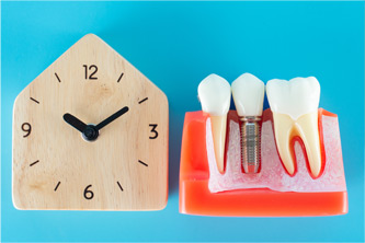 A. 一般的に、あごの骨に入れた人工歯根(インプラント)が周りの骨と結合するのに、6~24週間かかります。結合した後、上部に冠状の人工歯を取り付けますが、これに期間がかかる場合とそうでない場合があり、個人差があります。 症例や骨の状態によっては、数週間で上部の人工歯まで入れることができるケースもありますので、初診時にご相談ください。
