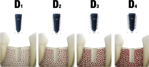 インプラントにおける骨質については硬い骨質のD1から柔らかいD4まで4段階に分類されており、CT画像から精密な診断が可能です。骨は柔らければ柔らかいほど初期固定が得にくく、インプラント体との結合にはリスク要素となります。