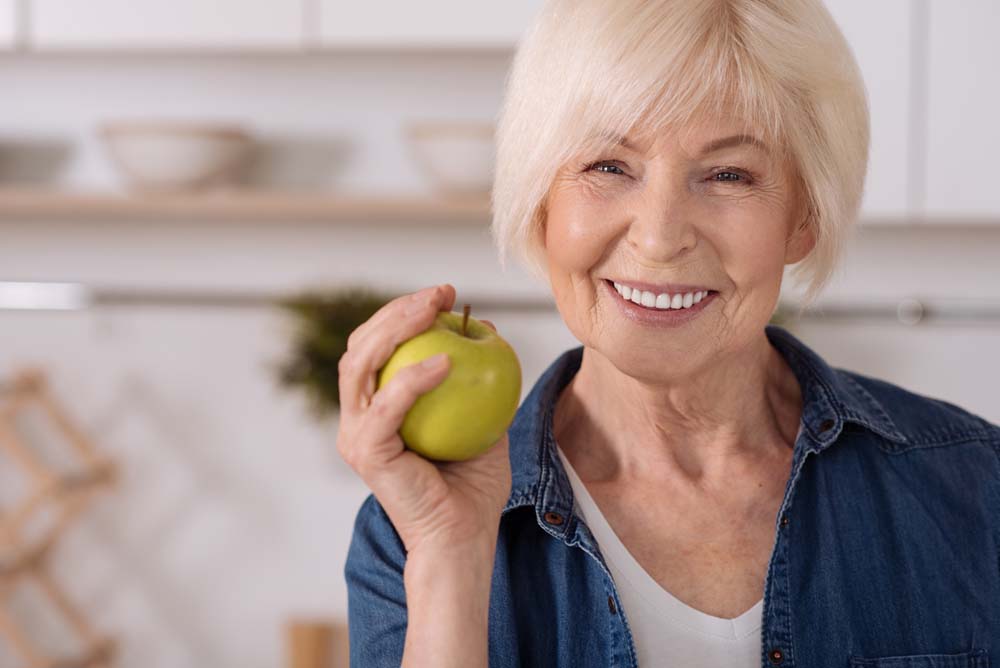 インプラントはあごの骨に埋入した人工歯根により、噛む力は天然歯と遜色がなく、硬いものでもなんでも食べられます。“インプラントをしたことを忘れてしまう”という患者さまも多く、入れ歯で苦労したのがうそのようだとおっしゃいます。ただ、インプラントも自然の歯と同様に限界がありますので、歯を思い切り食いしばることやあごに負担のかかるような硬い食品(堅いせんべいやピーナッツなどの種実類、するめなど)を毎日のように召し上がることは避けていただいた方がよろしいかと思います。インプラントをあまり意識する必要はありませんが、天然歯と同様に大切に扱っていただければと思います。