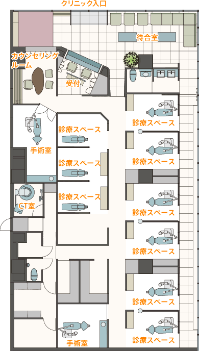 川口リボンシティ歯科・矯正歯科 インプラントでは診療室9部屋、手術室2部屋と他の歯科医院に比べて多くの施術室をご用意しています。これは、医院理念である『満足+α』から、できるだけ患者さんをお待たせすることなく診療したいという観点から院内レイアウトを考えています。