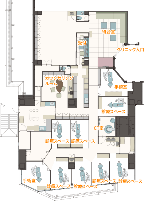 高田馬場リボン歯科・矯正歯科 インプラントでは診療室7部屋、手術室2部屋と他の歯科医院に比べて多くの施術室をご用意しています。これは、医院理念である『満足+α』から、できるだけ患者さんをお待たせすることなく診療したいという観点から院内レイアウトを考えています。